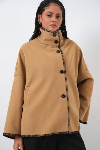 Kadın uzun kollu hakim yakalı önden düğmeli cep detaylı kısa kaşe kaban