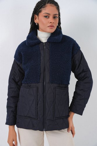 5182 Peluş Detaylı Oversize Şişme Mont Lacivert