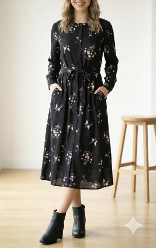 Kadın uzun kollu hakim yakalı düğmeli kuşaklı desenli maxi mikro süprem elbise