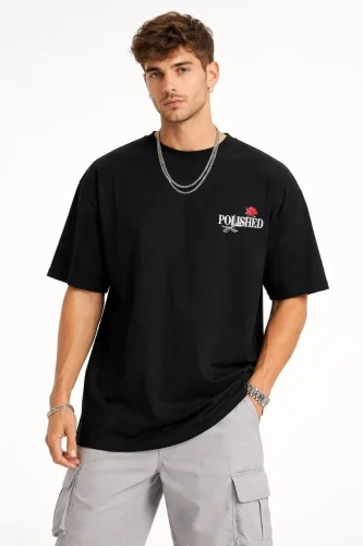 Erkek Bisiklet Yaka Baskılı Kısa Kollu Tişört Streetwear Günlük Basic Pamuklu Tshirt Siyah