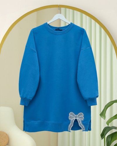 Yuvarlak Yaka Eteği Fiyonk Detaylı Salaş Penye Tunik Mavi