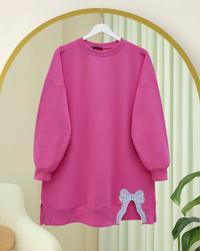 Yuvarlak Yaka Eteği Fiyonk Detaylı Salaş Penye Tunik Pembe