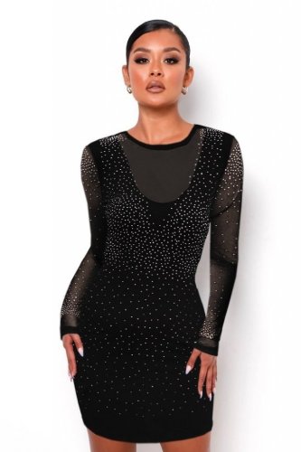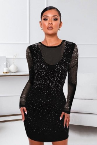 • Kadın uzun kollu yuvarlak yaka dekolteli taşlı dalgıç elbise
