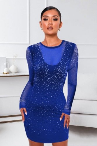 • Kadın uzun kollu yuvarlak yaka dekolteli taşlı dalgıç elbise