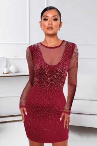 • Kadın uzun kollu yuvarlak yaka dekolteli taşlı dalgıç elbise