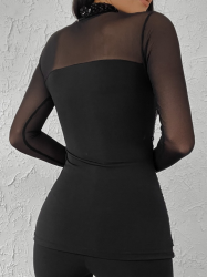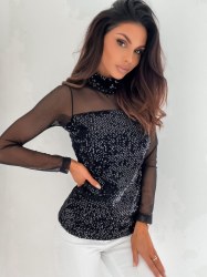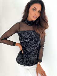 Kadın siyah uzun kollu kolları ve dekolte tül ve payet detay balıkçı yaka bluz