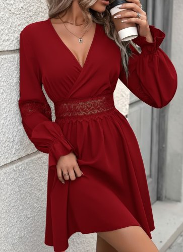 • Kadın uzun kollu kruvaze yakalı dantelli fermuar detaylı mini ithal krep elbise