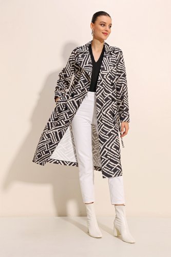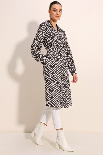 • 5853 Desenli Kruvaze Yaka Trençkot C Siyah