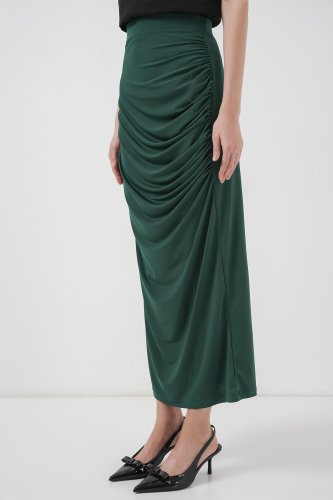 8035 Büzgülü Midi Etek Zümrüt Yeşili