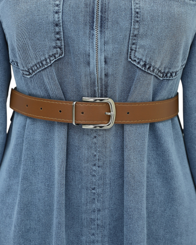 • Bebe Yaka Yarım Fermuarlı İnci Detaylı Kemerli Kot Elbise Buz Mavi