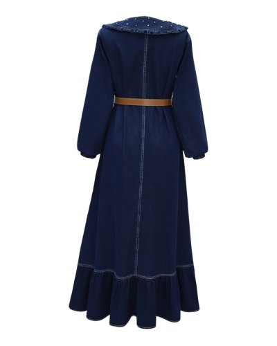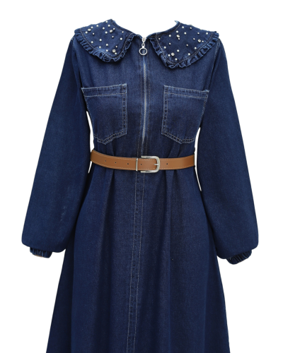 Bebe Yaka Yarım Fermuarlı İnci Detaylı Kemerli Kot Elbise Laci