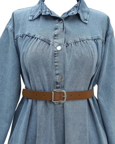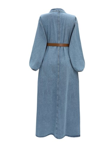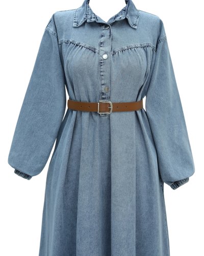 • Yarım Düğmeli Kolu Lastikli Kemerli Kot Elbise Buz Mavi