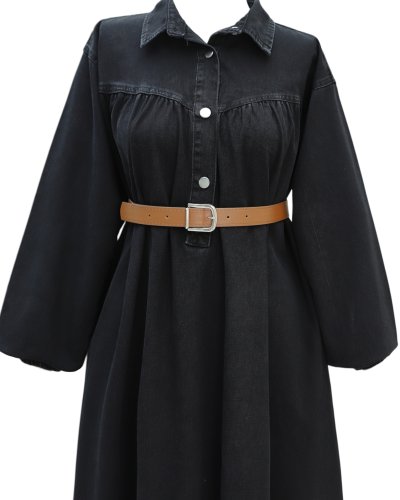 Yarım Düğmeli Kolu Lastikli Kemerli Kot Elbise Siyah