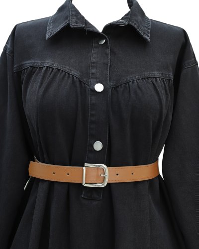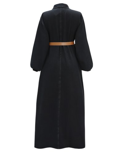 • Yarım Düğmeli Kolu Lastikli Kemerli Kot Elbise Siyah