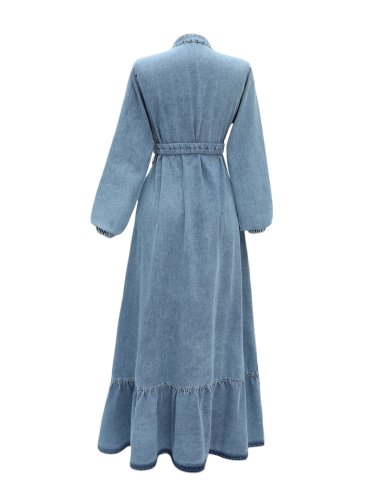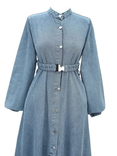 • Lastik Kemerli Düğmeli Uzun Kot Elbise Buz Mavi