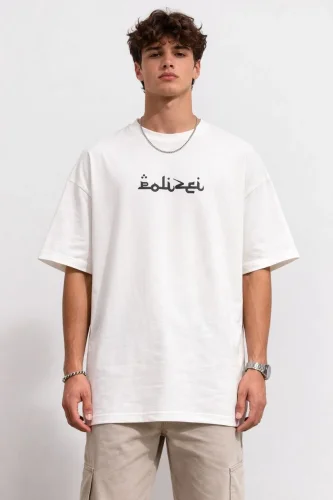 Erkek Bisiklet Yaka Baskılı Kısa Kollu Tişört Streetwear Günlük Basic Pamuklu Tshirt Beyaz