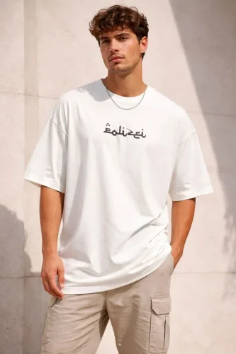 • Erkek Bisiklet Yaka Baskılı Kısa Kollu Tişört Streetwear Günlük Basic Pamuklu Tshirt Beyaz