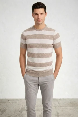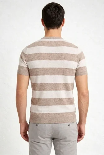 Erkek Tshirt Çizgili Triko Dokuma Bisiklet Yaka Tişört Bej