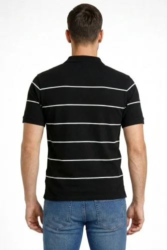 Erkek Tshirt Çizgili Triko Dokuma Kumaş Polo Yaka Yarım Fermuarlı Regular Kalıp Tişört Siyah