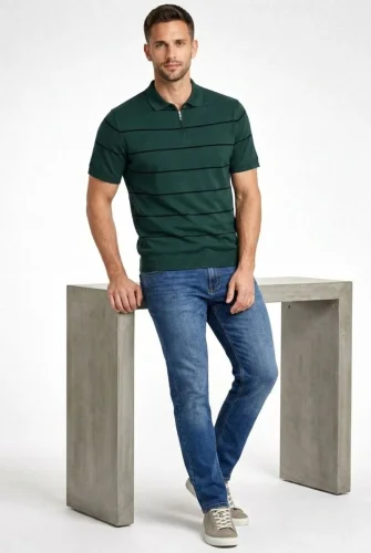 • Erkek Tshirt Çizgili Triko Dokuma Kumaş Polo Yaka Yarım Fermuarlı Regular Kalıp Tişört Çağla Yeşili