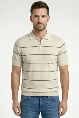 • Erkek Tshirt Çizgili Triko Dokuma Kumaş Polo Yaka Yarım Fermuarlı Regular Kalıp Tişört Bej