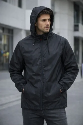 • Erkek Kapüşonlu Su İtici Rüzgarlık Ceket Mevsimlik Hafif Mont Siyah
