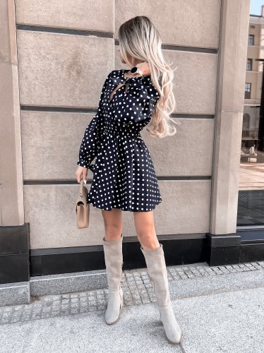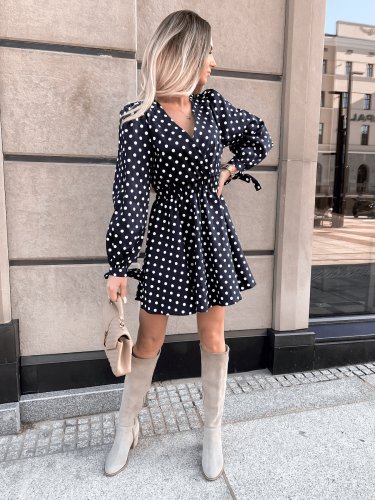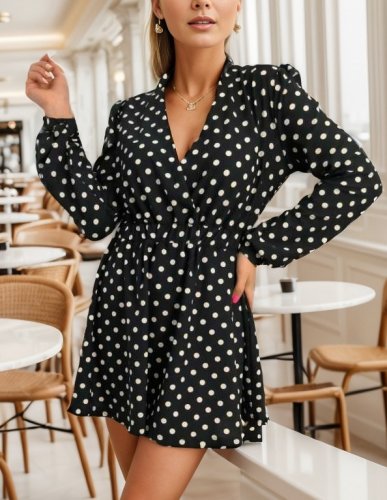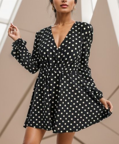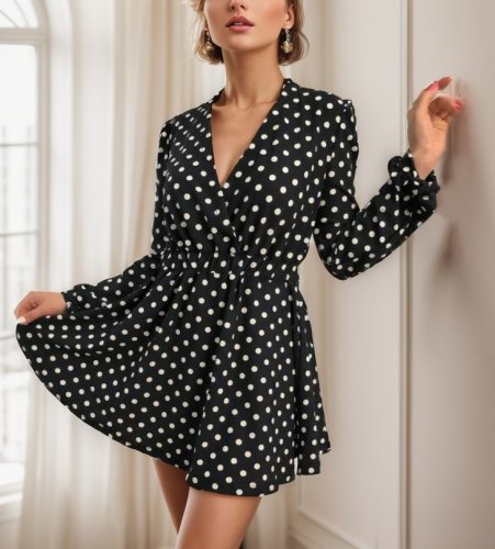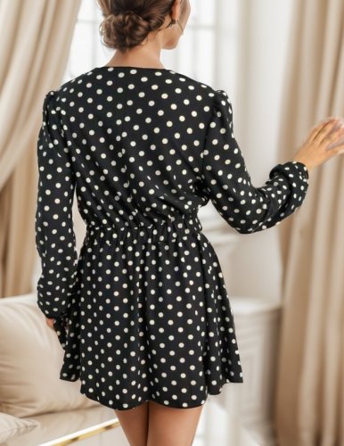 • Kadın uzun kollu kruvaze yaka puantiyeli desen krep mini boy elbise