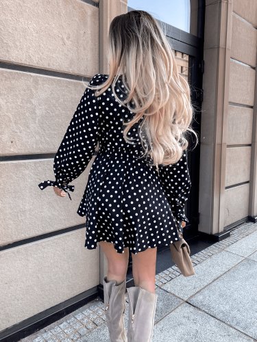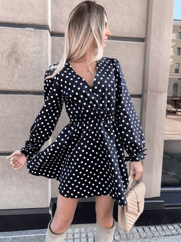 Kadın uzun kollu kruvaze yaka puantiyeli desen krep mini boy elbise